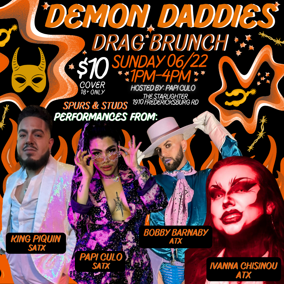 Back to All Events Demon Daddies Drag Brunch Sunday, June 22, 2025 1:00 PM 4:00 PM The Starlighter 1910 Fredericksburg Road San Antonio, TX, 78201 United States (map) Google Calendar ICS Demon Daddies Drag Brunch, hosted by Papi Culo, is back at The Starlighter, along with a cast of drag performers. This is a ticketed event. For more information, visit their social media (Facebook and Instagram) or website.
